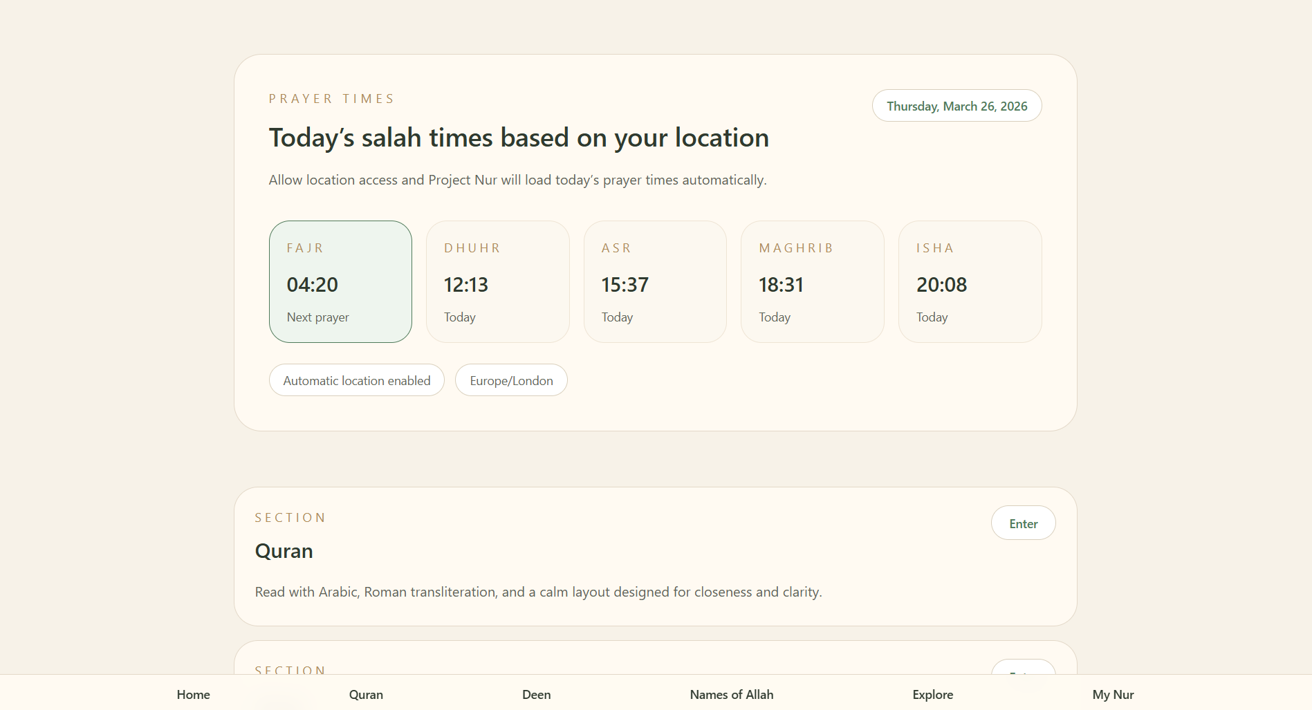 An Islamic web app built with both frontend and backend functionality, featuring Quran access and useful information related to deen.